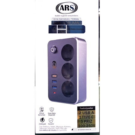 ARS 3'lü 2Mt Kablolu Akım Korumalı Priz (2xUSB, 1xType-C Girişli) Özellikleri