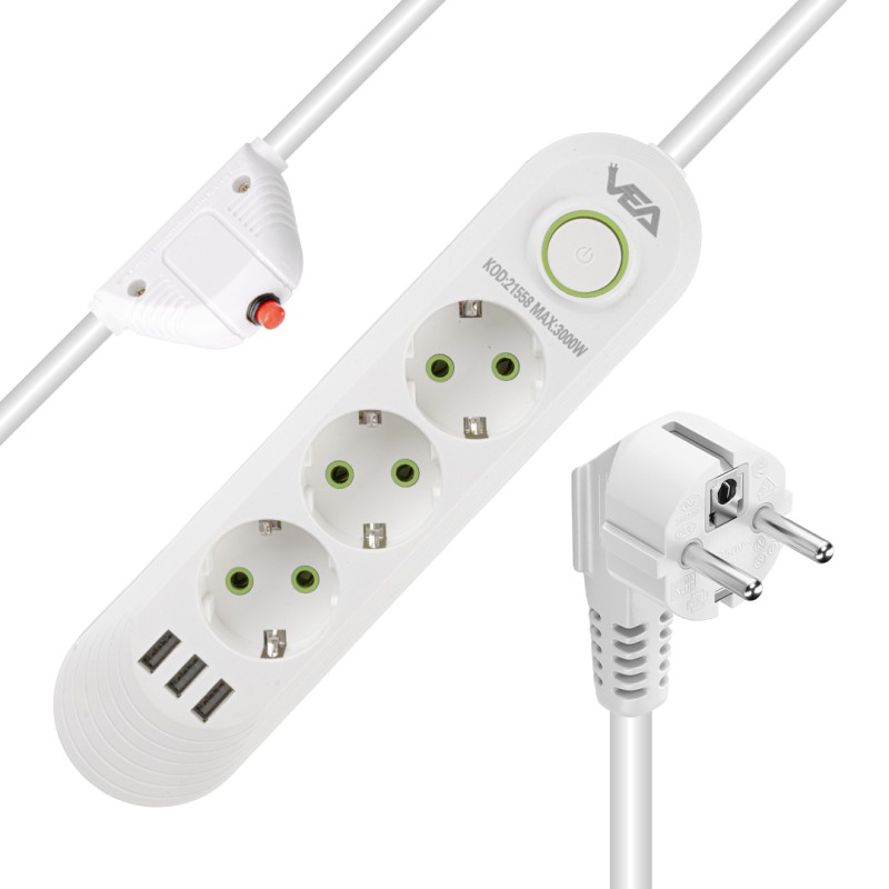 3 Priz ve 3 USB Çıkışı: Vea VA-21558, üç adet priz ve üç adet USB çıkışı ile donatılmıştır, böylece çok sayıda elektronik cihazı aynı anda şarj edebilir veya kullanabilirsiniz. Prizler, geniş aralıklı tasarımı sayesinde farklı priz tiplerine uyum sağlar.