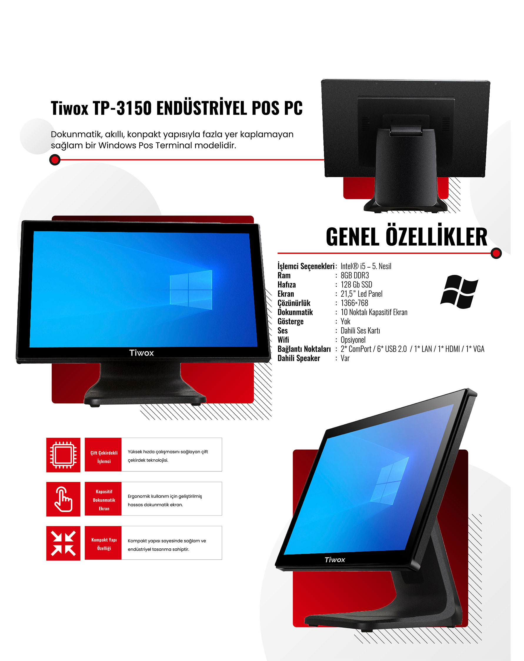 Tiwox TP-3150, Intel i5 5.Nesil, 21.5" Ekran, 8GB Ram, 128GB SSD, Endüstriyel, Dokunmatik Pos PC