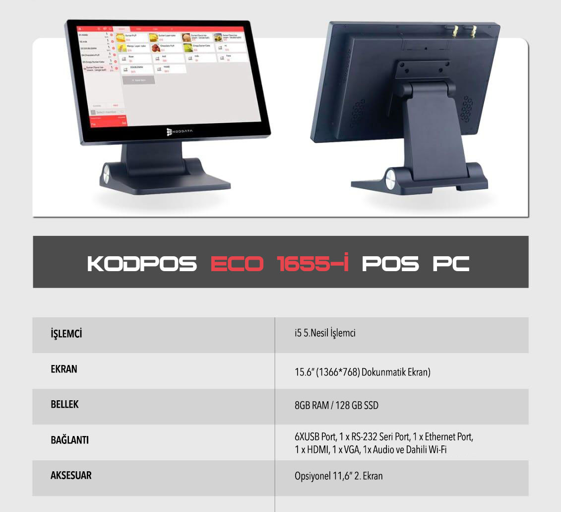 KodPos Eco 1655-İ, Intel i5 5.Nesil, 15.6" - 11,6" Ekran, 8GB Ram, 128GB SSD, Endüstriyel, Dokunmatik Pos PC (Çift Ekran)