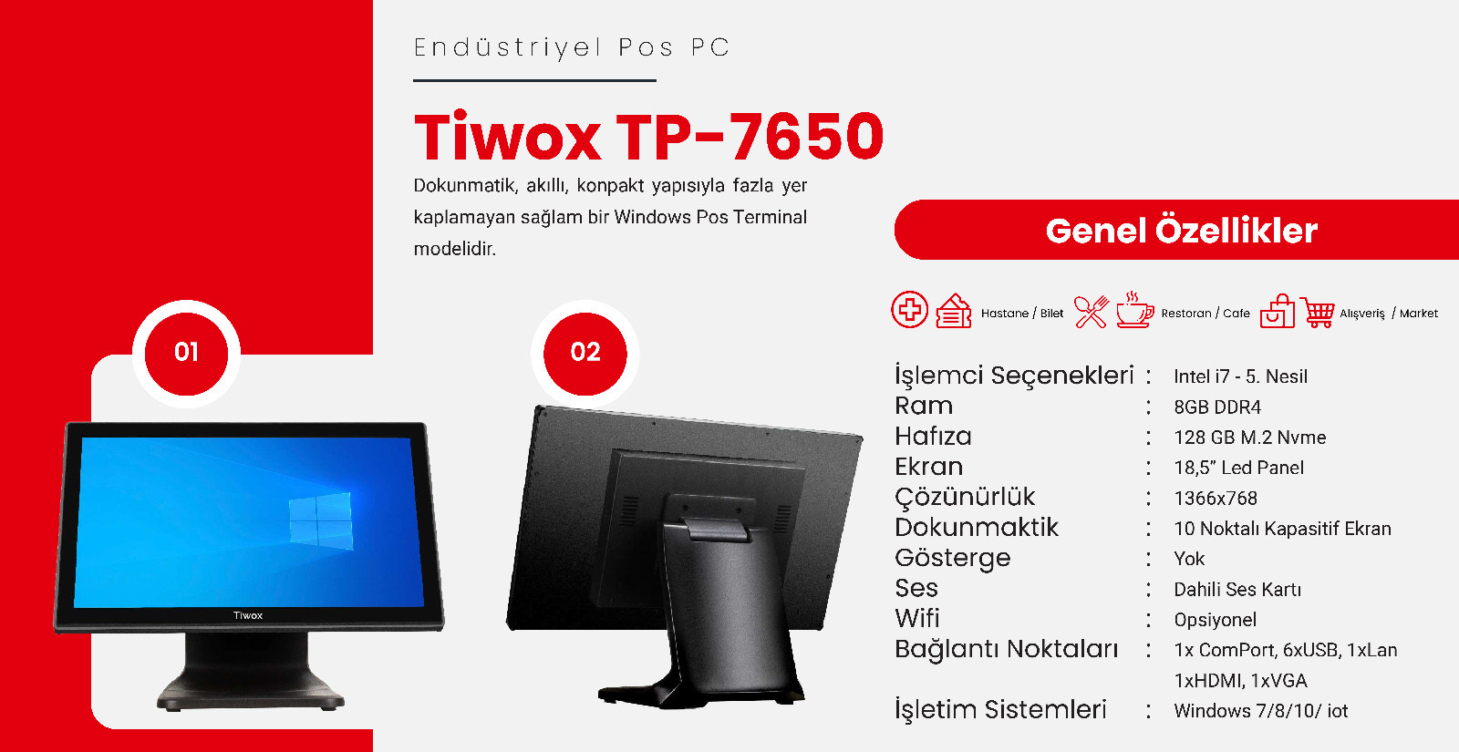 Tiwox TP-7650, Intel i7 5.Nesil, 18.5" Ekran, 8GB Ram, 128GB M.2 SSD, Endüstriyel, Dokunmatik Pos PC