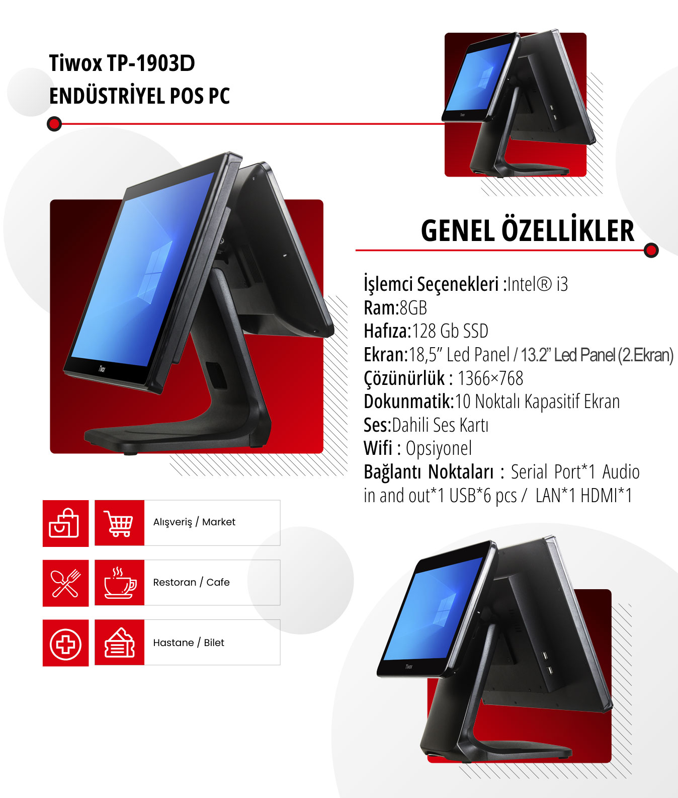 Tiwox TP-1903-D, Intel i3 3.Nesil, 18.5" Ekran, 8GB Ram, 128GB SSD, Endüstriyel, Dokunmatik Pos PC (çift ekran)