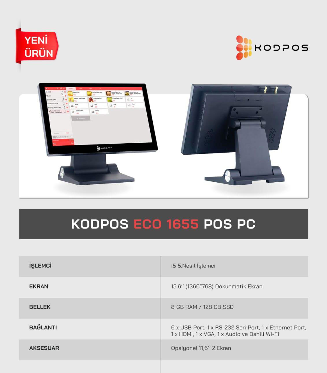 KodPos Eco 1655-İ, Intel i5 5.Nesil, 15.6" Ekran, 8GB Ram, 128GB SSD, Endüstriyel, Dokunmatik Pos PC